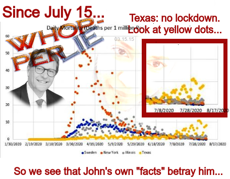 But from this comparison of “fish, to bicycles“… he comically “deduces” that a “no lockdowns” scenario, nationwide, would have saved us many net lives, in the US. The main problem is… in his own chartno less… he blithely ignores the Texas data — which (as his goofy doctor points out)… was (mostly) a no lockdowns approach.