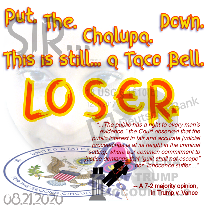 UPDATED @ 3 PM EDT on Friday: The trial court, for its part, has just now DENIED any stay (beyond the seven day stay already agreed to, by Cy Vance’s office). So now it is only the Second Circuit that might temporarily delay the execution of the subpoena, thus: “…The Court will deny the Motion for substantially the same reasons it denied the President’s request for injunctive relief in the [prior] Order. Indeed, in that Order the Court thoroughly addressed and rejected the President’s claim that disclosure of his financial records to the District Attorney would cause him irreparable harm. The President now relies on largely the same cases, but as the Court explained in its [prior] Order, these cases do not pertain to ongoing criminal investigations, let alone investigations by grand juries who are sworn to secrecy….