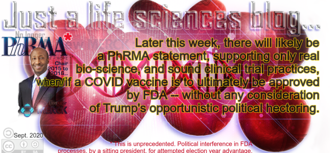In truth, as to FDA vaccine approvals, there has never been need — in the past 100 years, certainly — for scientists to speak out against a then-sitting president, one who is attempting to push his thumb down (for a supposed-re-election advantage) — on the scales of good clinical trial practices, in the process for an eventually-FDA approved COVID-19 vaccine.