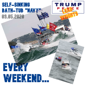 But I suppose (less-seriously), the best metaphor for this above (and below) Trumpian attempt — is the now three weekends’ running self-sinkings — in his would-be supporters’ “bath-tub navy“… [or as they refer to themselves in central Illinois, “white trash boaters, who vote“] as most of these supporters aren’t even smart enough to understand the scientific principle of wave- (or in this case, wake-) amplification — in an enclosed body of water. I am genuinely glad no one was injured, but seriously — if this is his base… it explains… so, so much. Onward, grinning.