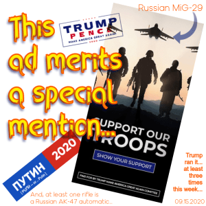 And perhaps saddest of all — we all know these sorts of plain influence, in the open (or at least, stunning incompetence, in his senior campaign creatives staff) won’t change a thing, for his “base.” They will say he is “trolling the libs“. I will say… my brothers’ buddies (in Vietnam) — to say nothing of my dad’s buddies, in Korea, or my grandad’s brothers (in Europe)… didn’t know they were sacrificing their very lives, on the fields of battle… for this… insanity.