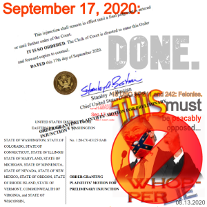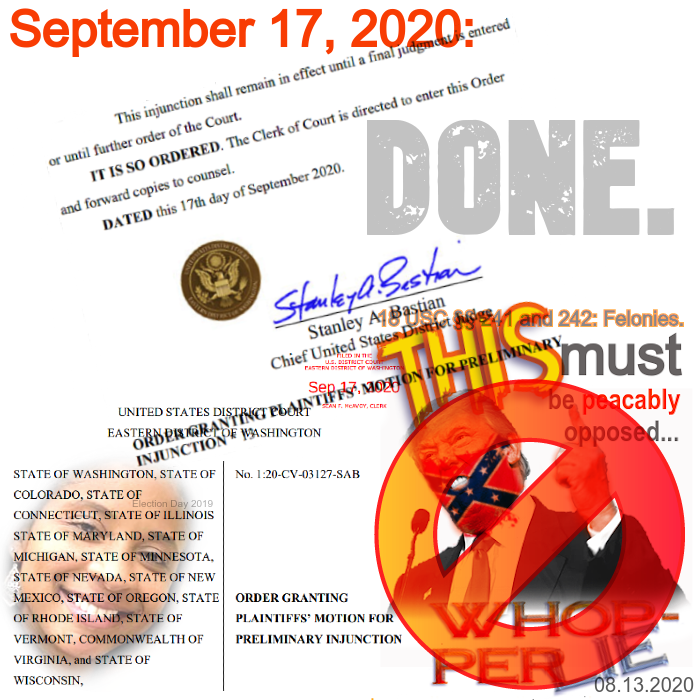 A few hours ago, and as we long predicted, a federal judge in Washington state issued a nationwide preliminary injunction against DeJoy’s felonious attempts at vote suppression / tamperings, by what purported to be USPS procedural changes, essentially-immediately prior to election day 2020. These chuckleheads are the most inept crooks on the planet.
