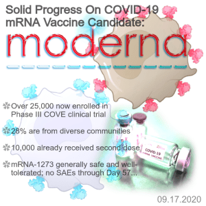 As of Wednesday, September 16, 2020, 25,296 participants have been enrolled in the Phase 3 COVE study and approximately 28% of participants enrolled cumulatively are from diverse communities. 10,025 participants have received their second vaccination. The protocol for the study being conducted in collaboration with the NIH and BARDA is now publicly available. On July 14, an interim analysis of the original cohorts in the NIH-led Phase 1 study evaluating a two-dose vaccination schedule of mRNA-1273 across three dose levels (25, 100, 250 µg) in 45 healthy adults ages 18-55 years was published in The New England Journal of Medicine and shows mRNA-1273 induced rapid and strong immune responses against SARS-CoV-2.