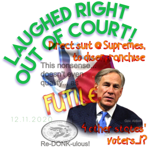 In under three elapsed hours — from the filing of a substantive final reply by Texas — to the cogent briefs from Wisconsin, Michigan, Georgia and Pennsylvania (among many others)… The Tangerine Mussolini is bounced out on his oafish a$$ — from the Supremes. No hearing — no longer even on the docket. No standing: