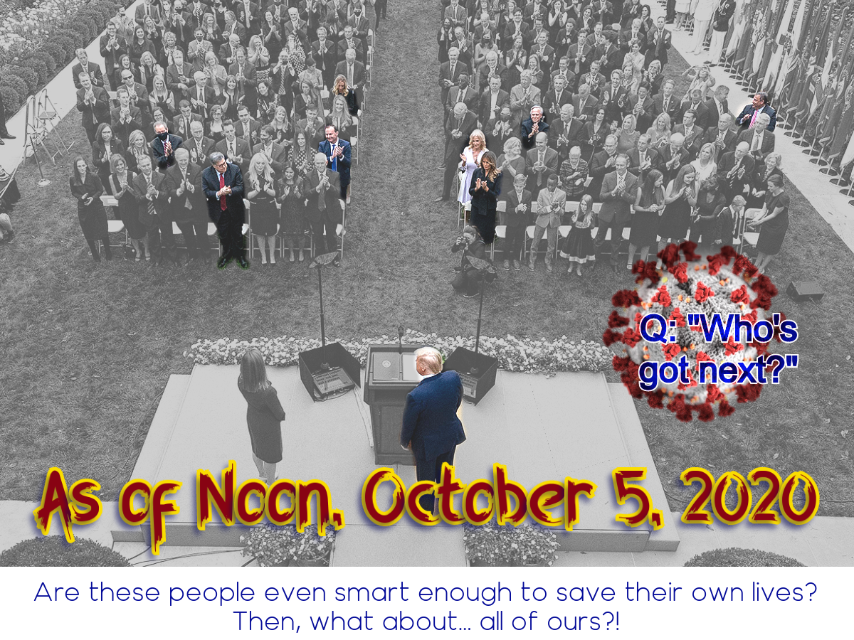 Rather than take an unearned, wildly-too-early victory lap, this morning, I’d prefer if DC generally — both Democrats and Republicans (but mostly Republicans) would take a close look at how quickly maskless, close quarters events may (and in fact, do) turn into super-spreading tendrils of suffering. Consider that Rudy G., and Jenna Ellis and dozens of others regularly attend 1600 Penn events in close quarters without masks (and now over 75 of them are COVID-19 positive). Here, from MassLive, is the summary: