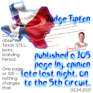 I last checked the docket in Houston after 11 PM EST. Sometime around Midnight, Texas time, USDC Judge Tipton dropped the below opinion onto the PACER feed. [His earlier issued TRO was to expire at Midnight, and I get why he’d prefer this not garner a lot of press.] It is simply egregiously wrong — on the existing, controlling Supreme Court precedents.