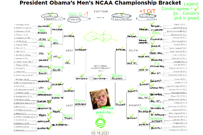 Finally, my Buffs drew a tough bracket — just as Loyola did — and so they don’t go very far. [But if the Buffs even go as far as I’ve predicted, that may be my margin of victory over our 44th President, since he has them losing in the first round. We shall see.]