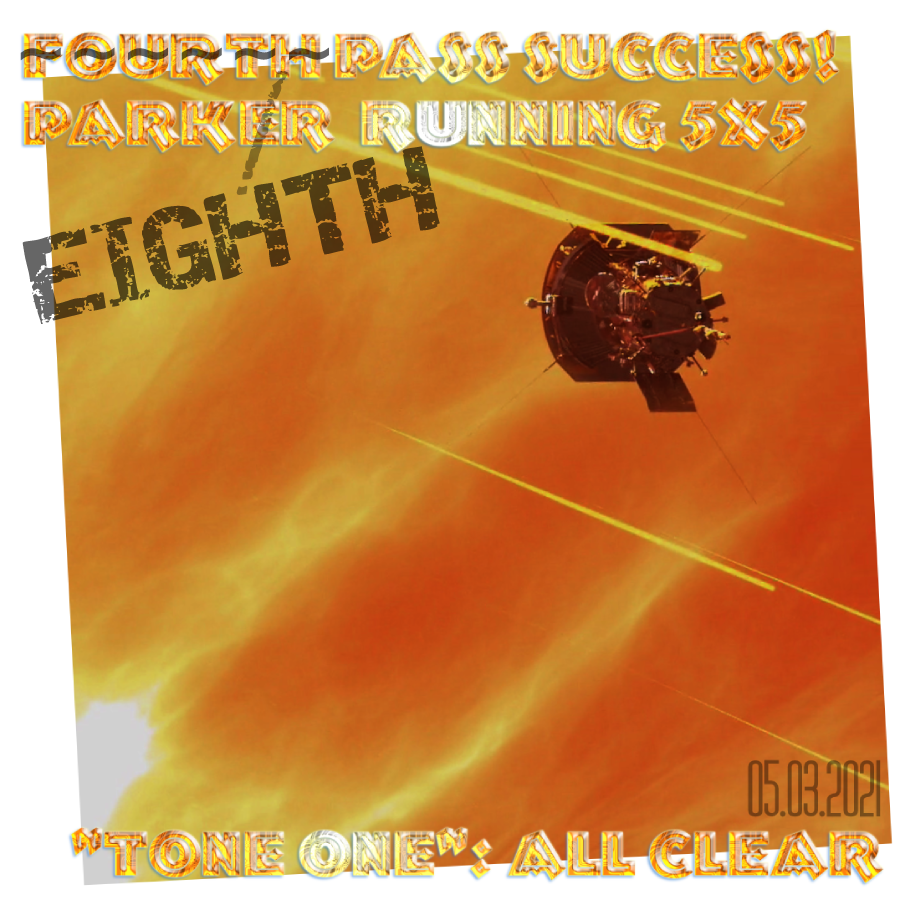 …On May 2, 2021, at 3:00 a.m. EDT, mission controllers at the Johns Hopkins University Applied Physics Laboratory, in Laurel, Maryland, received a “tone one” beacon from Parker Solar Probe, indicating that all systems were healthy and operating normally after the spacecraft’s eighth close approach to the Sun on April 29.