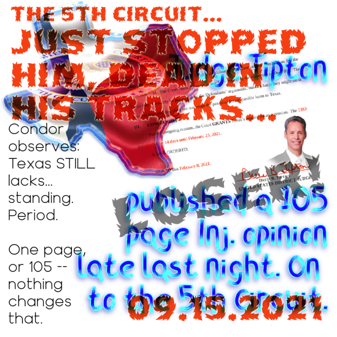In sum, the Fifth Circuit just said that young Judge Tipton simply “made up” this opinion, from whole cloth. This is the starkest rebuke imaginable: a GOP-leaning Fifth Circuit just effectively said he failed a simple statutory reading test. One with clear Supreme Court lamp-posts, to light his path. And he. . . ignored them. Ouch.