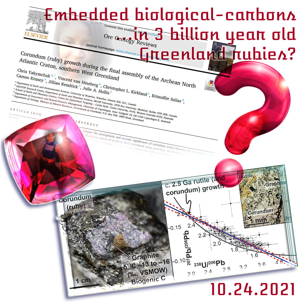Do read this geology / ore journal / paper. . . or. . . more than likely — you won’t. Heh. It is thick with all the usual science jargon. The punchline though, is that the kind of carbon embedded in this ruby likely could only have formed in a biological (microbial) process. While life is thought by many scientists to have existed even over 3 billion years ago, that notion is debated — mostly for lack of more concrete evidence.