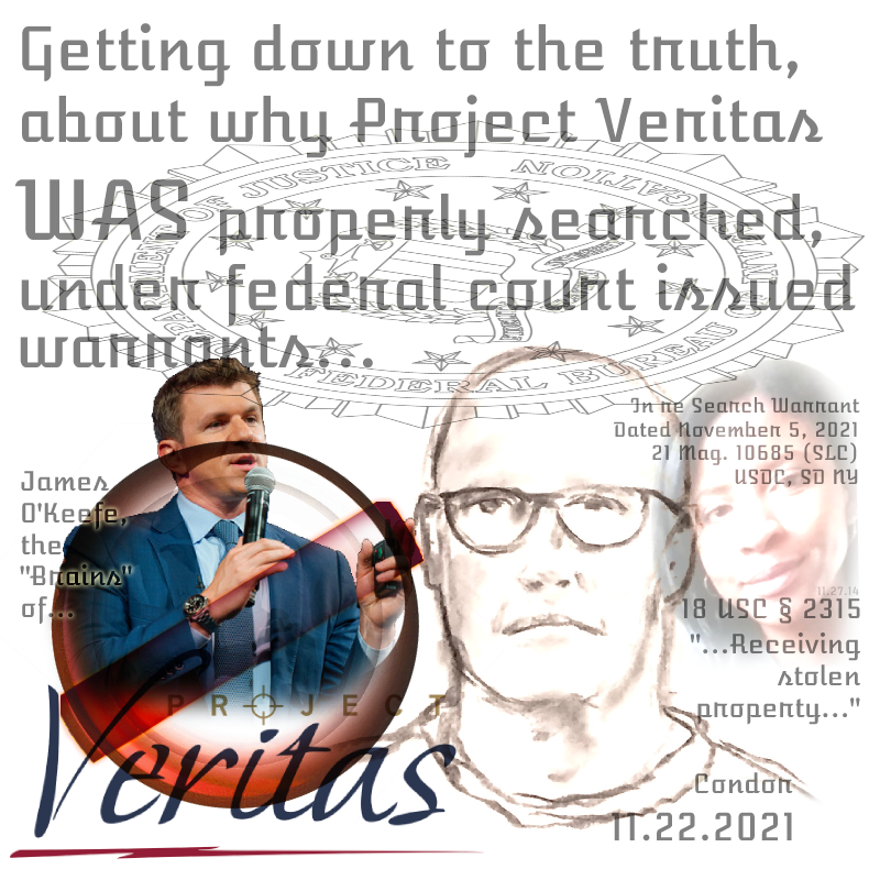 The FBI has now effectively sworn in open federal court (at electronic page 5; main document page 1), in addition to swearing in secret pre-grand jury indictment proceedings, that the cell phones of James O’Keefe contain evidence of receiving knowingly stolen property — and then at least trying to facilitate the resale of it, if not profit from the sale, directly. All of those things, if the value discussed was over $5,000 — are felonies. See, 18 USC § 2315, et seq.. Felonies still under active investigation.