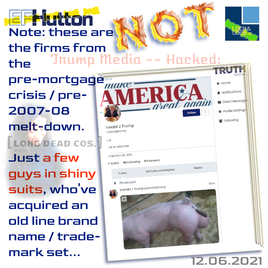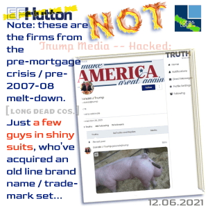 Finally, and almost trivially — given the above wildly stupid ideas, the SEC and FINRA are requesting documents (see Item 8.01 here), about who knew what, when — and the two are scrutinizing the trading volumes prior to the announced deal with Tangerine — at DWAC. Seems clear there were potentially criminal (felony) tippees trading, based on undisclosed inside material information, immediately prior.