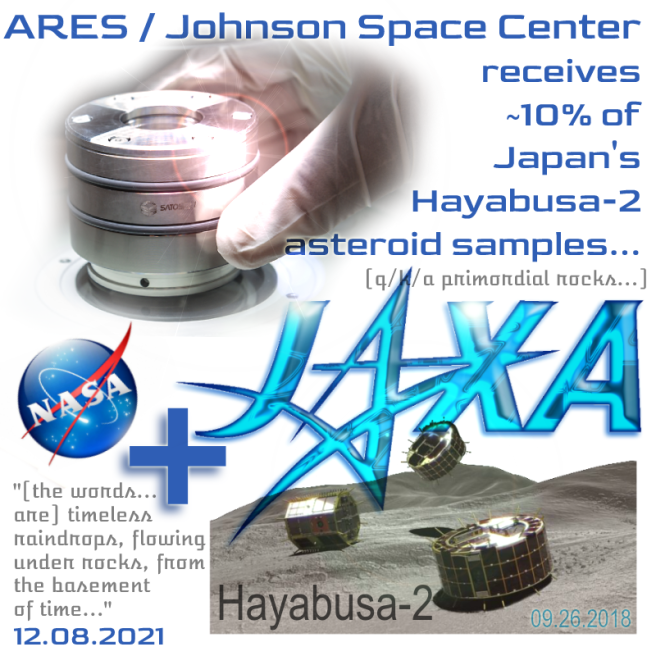NASA received 23 millimeter-sized grains and 4 containers of even finer material from Ryugu — 10 percent of the total collected – from JAXA on Nov. 30. A JAXA official and a JAXA scientist delivered the asteroid fragments to Johnson, meeting with agency team members to complete the sample transfer and receiving training on safe handling procedures for their portion of the OSIRIS-REx samples….