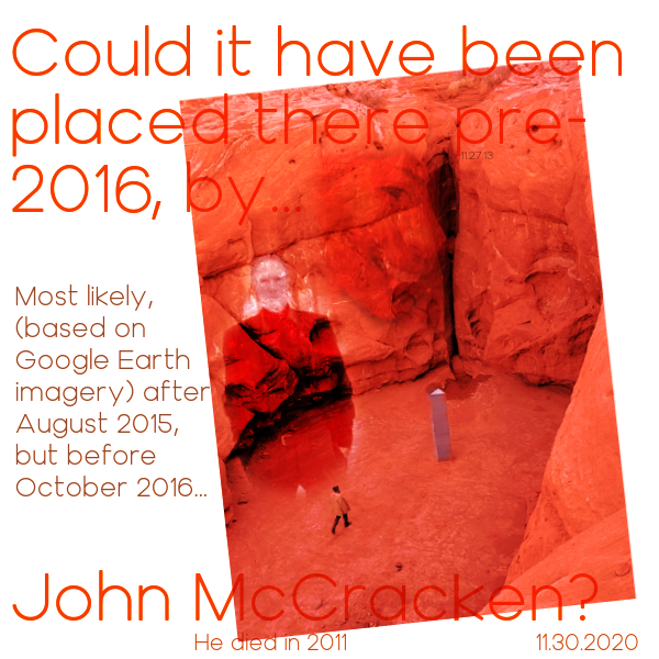 Or… (perhaps!) more monoliths may appear this spring in canyons in Utah, Arizona and northern California (or western Oregon). We shall see… smiling widely, now.