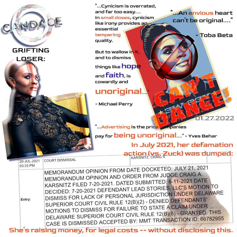 UPDATED 02.10.2022 @ Noon EST: I am NOW guessing that all this tweeting by Owens yesterday refers, in fact, to a preliminary discovery scheduling hearing (or some-such) in the $20 million Klacik defamation matter, in Baltimore’s local court system. There, Candace herself is being sued for falsely stating that a GOP candidate for elected office had committed crimes. So this is actually a story about her facing the same claims, as a defendant, as she made against Zuck, as a plaintiff — but with a much bigger price tag.