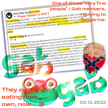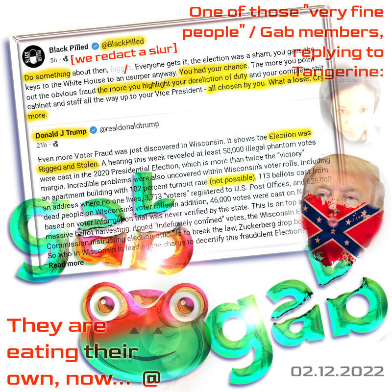 So I leave the image at left, largely to make a record for posterity. Gab.com will soon die (and all of this deeply hateful vitriol will vanish into the ether of ones and zeroes with it), as also will Parler and Gettr, and even Trump’s not yet launched… whatever it is he is trying to call it these days. Perfect… karma.