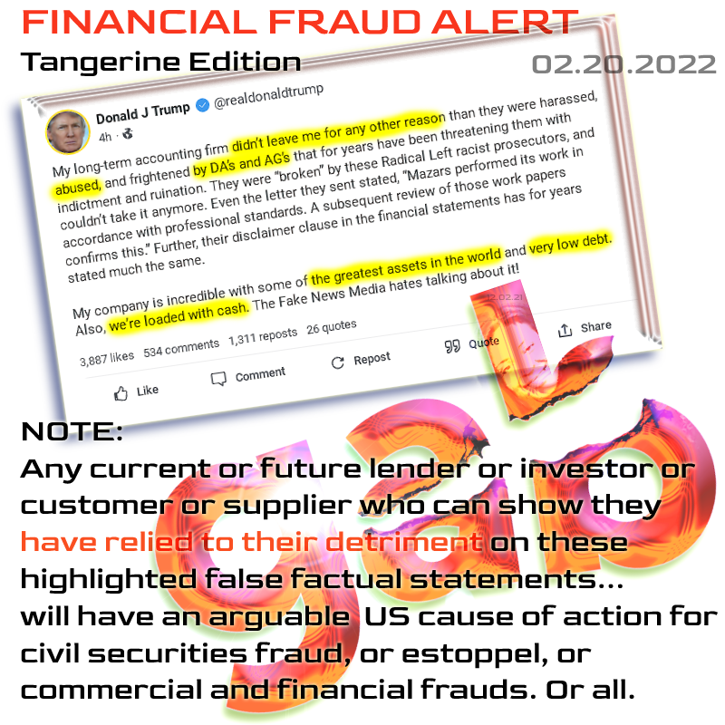It is convenient that he has set the statements out — in writing, for the world to see, effectively on national television (gab.com), in an advertisement on his own personal verified account, no less — at a time when it is certain that various lenders (at least) are considering calling his loans (in default) — for lack of audited financials. For ten years.