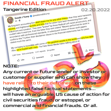 One thought on “At Law, This Is Known As A Materially-False Statement (About Financial Condition), Intended To Cause Third Parties To Contract, To Their Detriment…”