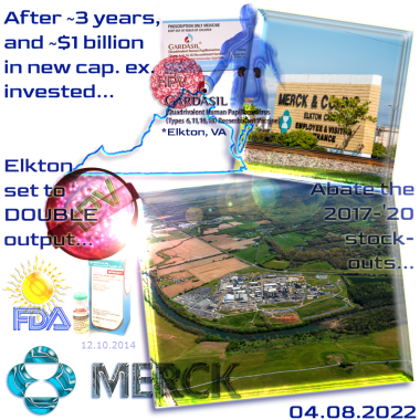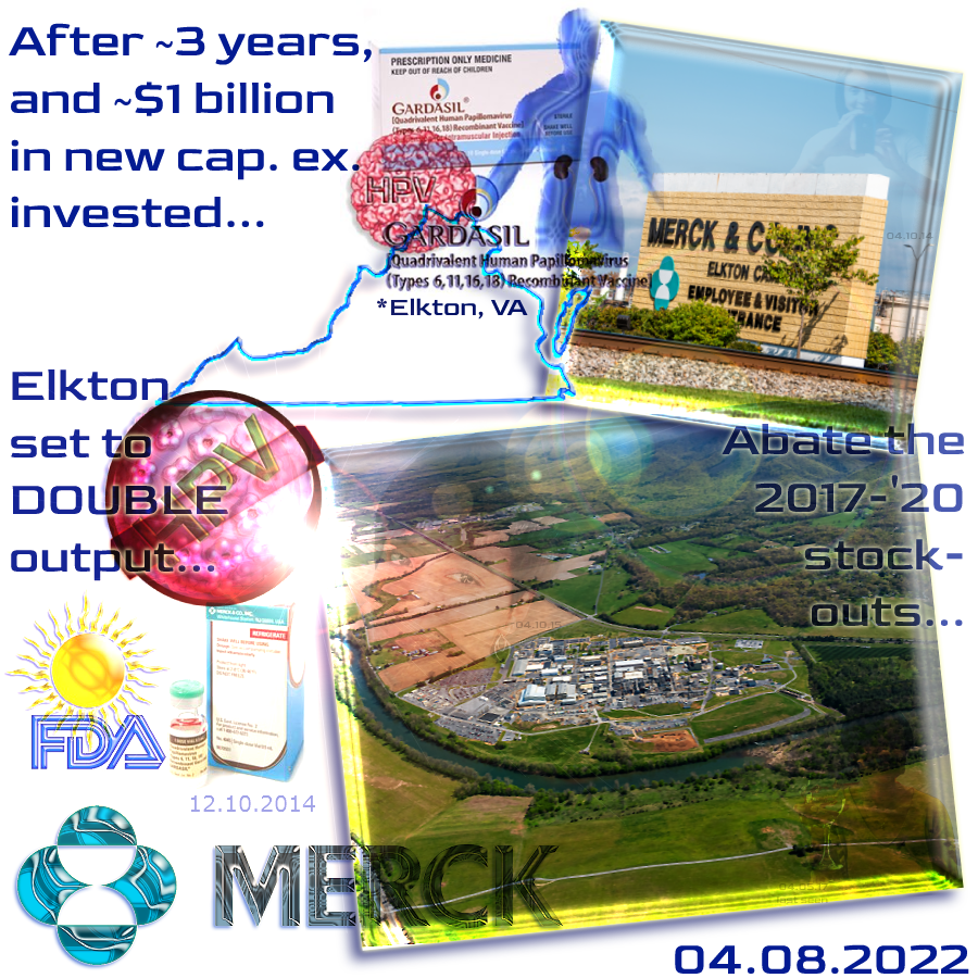 Since we did report the Cherokee layoff news in late March, it is only fair that we mention this. Earlier this week, Merck completed the more than $1 billion cap ex program at its Elkton, Virginia vaccine manufacturing plant. This, in turn will now allow it to once again double the US deliveries of the Gardasil® HPV vaccine. Equally important, it brings 150 new high-paying manufacturing line jobs to the community there. [That HPV jab has been in short supply since late 2017 — experiencing occasionally acute stock-outs, in 2018 in particular.]