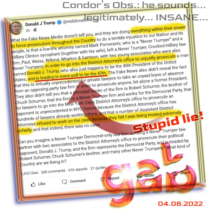 The claim tonight on gab [dot] com by Tangerine is that (wait for it!) HRC is “forcing” prosecutors “throughout the country” to bring (“unjust”) cases against him.