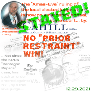 Make no mistake: The New York Times WILL prevail here. [Backgrounder here.] A Tangerine GOP Westchester County elected trial judge gave Veritas a win that was plainly contradicted by at least 75 years of US Supreme Court holdings, on a free press — the core, of a free democracy. Below is proof that this is getting straightened out, on appeal. We will keep you posted.