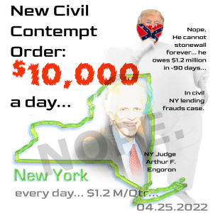 He will now be required to deposit and pay $10,000 per day into the court (while he appeals, no doubt), or about $1.2 million every quarter he continues to refuse to allow his cell phones to imaged, in the civil fraud investigation being led by NY AG Leticia James in the Empire State.