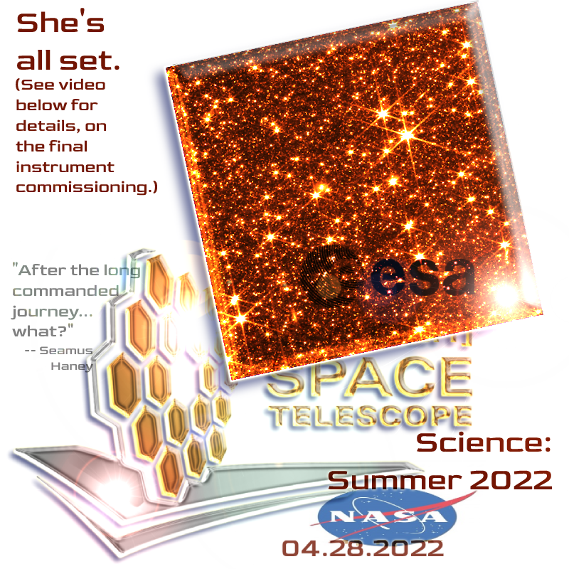 …Alignment of NASA’s [Next Gen] Space Telescope is now complete. After full review, the observatory has been confirmed to be capable of capturing crisp, well-focused images with each of its four powerful onboard science instruments. Upon completing the seventh and final stage of telescope alignment, the team held a set of key decision meetings and unanimously agreed that [the ‘scope] is ready to move forward into its next and final series of preparations, known as science instrument commissioning. This process will take about two months before scientific operations begin in the summer….