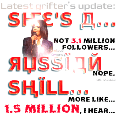 She — but of course! — ignores that in mid-2018 Tangerine’s follower count went up by about 25 million (bots) in two nights. Plainly, he bought the bot followers from a Russian oligarch connected “business(es)”.
