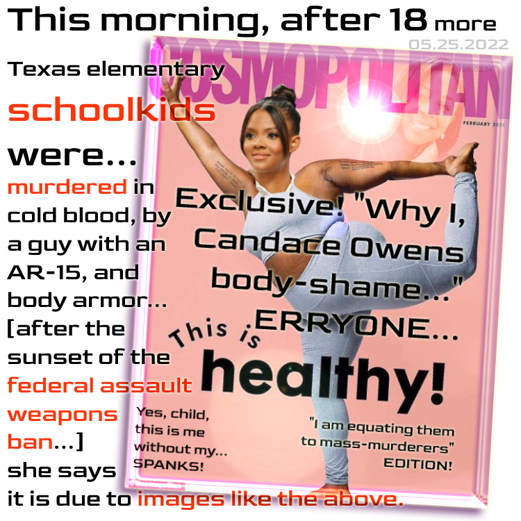 This morning — in a series of three completely insane tweets, Candace Owens lays blame for the 18 year old, whyte mass-shooter in Texas (who bought two AR-15s on his eighteenth birthday, without any supervision — or a background check)… a guy who murdered 18 unarmed elementary school-kids, and their teacher, in their classroom… wounding at least ten others, forcing them to watch their friends die horribly, before their eyes (and this was only an hour or so after he shot his own grandmother, in the face, in her home)…