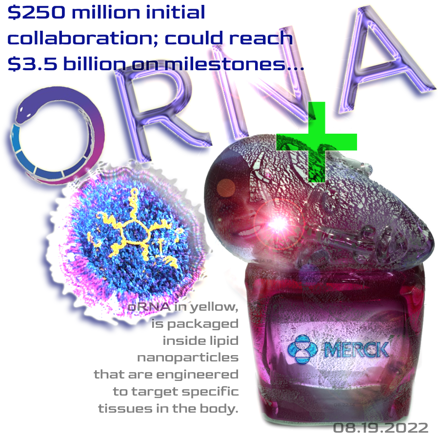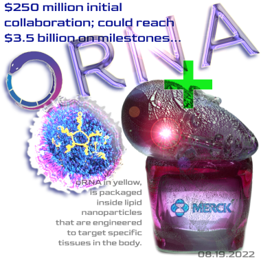 …Merck has entered a collaboration with circular RNA company Orna Therapeutics to develop several programs, including vaccines and therapeutics for infectious diseases and oncology. Merck will pay Orna $150 million up front and invest $100 million of equity in Orna’s series B financing round, which initially closed Aug. 16 with $221 million. Orna could receive up to $3.5 billion in milestone payments.