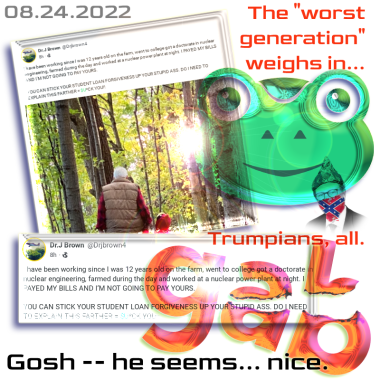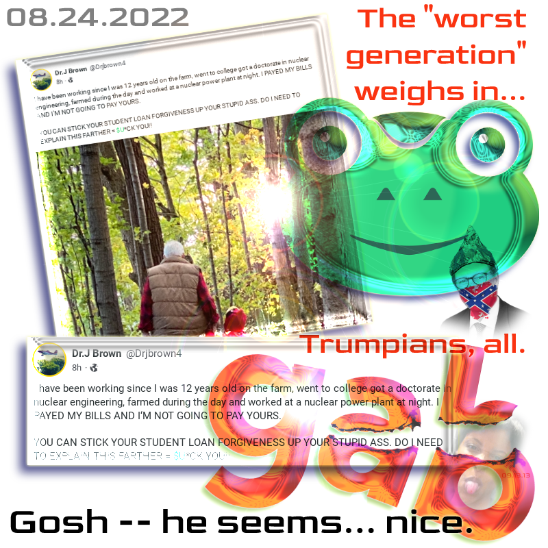 In any event, I offer the bit at above right, from a verified Gab dot com poster, claiming to be a doctorate. I doubt it. But he is entitled to his unkind opinion, to be sure.