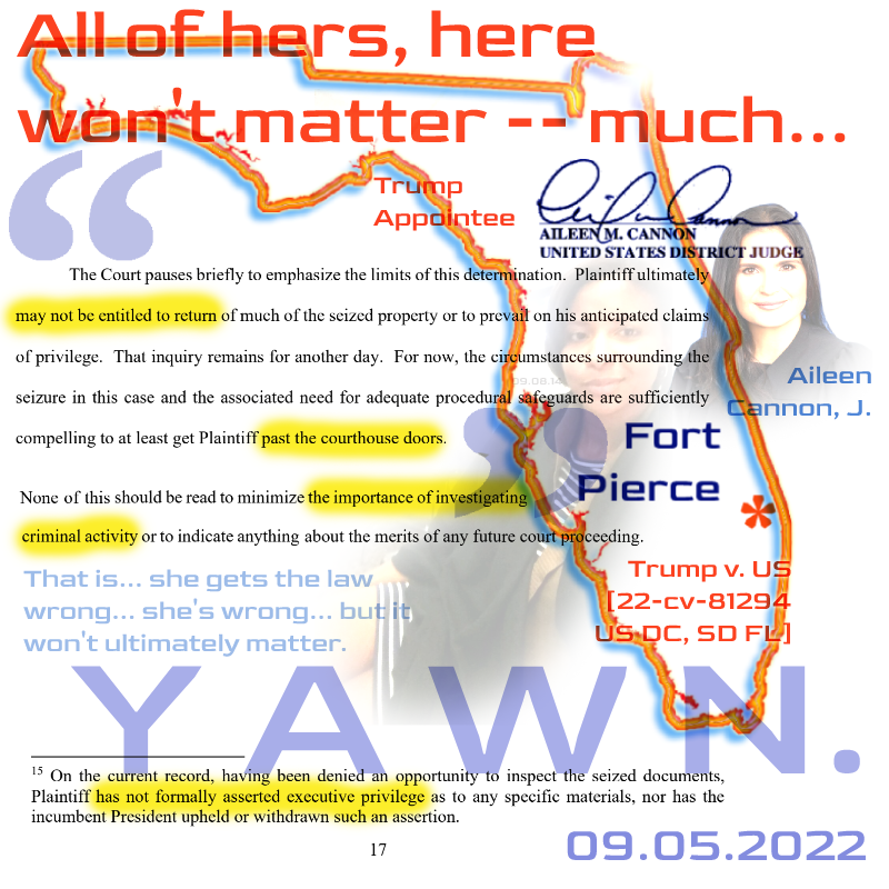 But as expected, Aileen Cannon, as a Tangerine appointee, has now definitively let this “crazy quilt” of a supposed civil “equitable” action in the court house doors. In the end, it won’t matter.