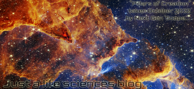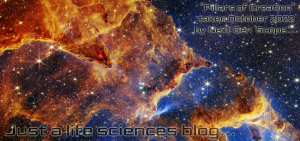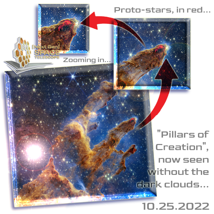Shown here in “representational” colors, so that our human eyes can see through the dark, dusty gray and brownish clouds (all that would be visible to the naked eye, in wavelengths we might resolve), inside the so-called Pillars of Creation — these stunning details emerge from inside the clouds, as imaged by the new space ‘scope.