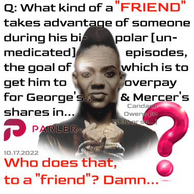 So — Ye paying perhaps $15 million cash — to buy out the Parler shareholders — the Mercers (and likely Candace’s husband, George Farmer) and bail them out of their “money pit”… is simply a grift against her supposed “friend”. A guy clearly suffering an ongoing mental break.