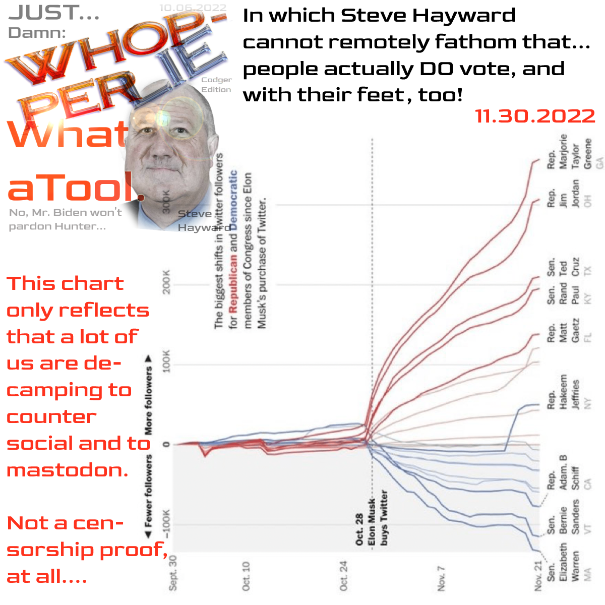 So… when it’s about making maximal ad revenue — John thinks Jack was “smart” to “admit” a mistake (one he will definitively never have to pay for, since he’s sold all his shares to Musk at ~$44 billion)… now that all agree (finally!) what happened was 100% lawful (that’s Hinderaker’s own admission of… defeat).