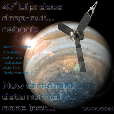 So — the mission team knew, even with all critical instruments loaded into titanium buckets for shielding, and many redundant systems, there could be degradation later in the mission. That is likely what the team just saw, on December 17, when Juno dropped data, and had to be rebooted in safe mode. But all is once again performing 5 by 5, tonight — thus: