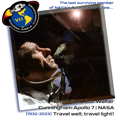 …“Walt Cunningham was a fighter pilot, physicist, and an entrepreneur – but, above all, he was an explorer. On Apollo 7, the first launch of a crewed Apollo mission, Walt and his crewmates made history, paving the way for the Artemis Generation we see today,” said NASA Administrator Bill Nelson. “NASA will always remember his contributions to our nation’s space program and sends our condolences to the Cunningham family.”
