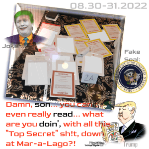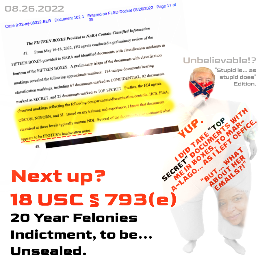 “But wait! There’s more!” Note that Trump flat out stole Top Secret documents, and flat out refused to return them until a raid was needed to get them back. Now note that yesterday Trump (on his dying social media site, no less) argued that this immediate return is something Mr. Biden should be PROSECUTED for. [Where irony goes… to die.]