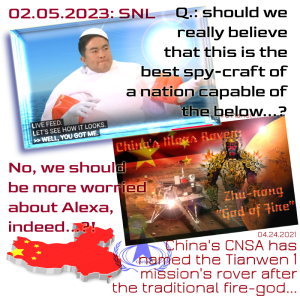 Finally, just to (again!) dismiss one other frothy far right nonsense claim: no, we will not press release DHS and CIA and military “means and methods”, related to that intrepid “red” balloon — but you may be assured that its signals were jammed, from the moment it reached Alaska’s shores, to the moment it splashed into the Atlantic off the shore of Myrtle Beach. So, it really doesn’t matter that it HAD communications monitoring gear onboard. China did tell the truth when it said it had “lost control” of the balloon, and that happened because we… jammed its signals / comms.