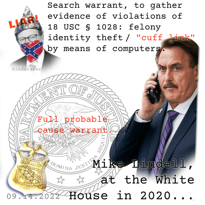 Like this one, where he arguably put faithful public servants — FBI agents and their families — in danger, by falsely, and knowingly so, claiming there was “no search warrant“ for Mike Lindell’s search and seizures — related to Tangerine’s 2020 Big Lie.