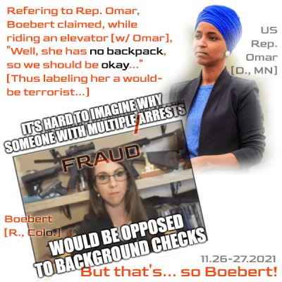 Funny, though — when Margrie Taylor Green screeched “Liar!” — in wild whyte ape fashion, during the state of the union, or when Boebert called Rep. Ilhan Omar a “terrorist” on the floor of the House… or when Santos falsely said he was Jew-ish (when he plainly… is not) on the floor and began trying supposedly Hebrew impersonations (in heavily Jewish Babylon, Long Island), for / on fund-raising calls… John uttered not a peep — didn’t make a sound.