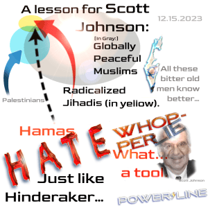 So… yes, based on your own lived experiences, guys — I do think this generation will grow up, and figure it out, Scott (and John, Steve and even Paul). All without engaging in Hinderaker’s calls for eradication of the the Palestinian peoples.