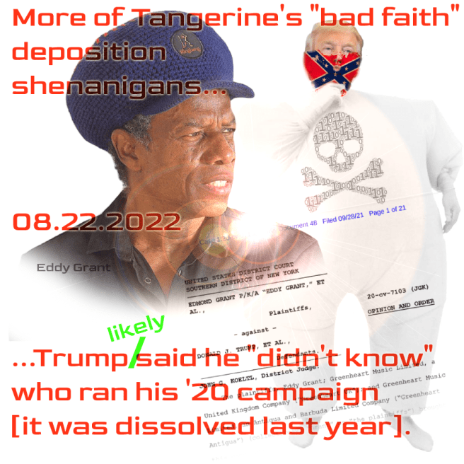 Tonight, the USDC in Manhattan ruled he is liable for that. The only task left now, is assess damages by trial. My bet is Tangerine will settle this one — rather than add to bevy of litigation already pending, where judgments have found him liable into the half-billion dollar range. It is supremely ironic that the musical work he stole… was originally a protest against Brixton (UK) police brutality — against Britons of color. Here’s the 31 page ruling — and a bit: