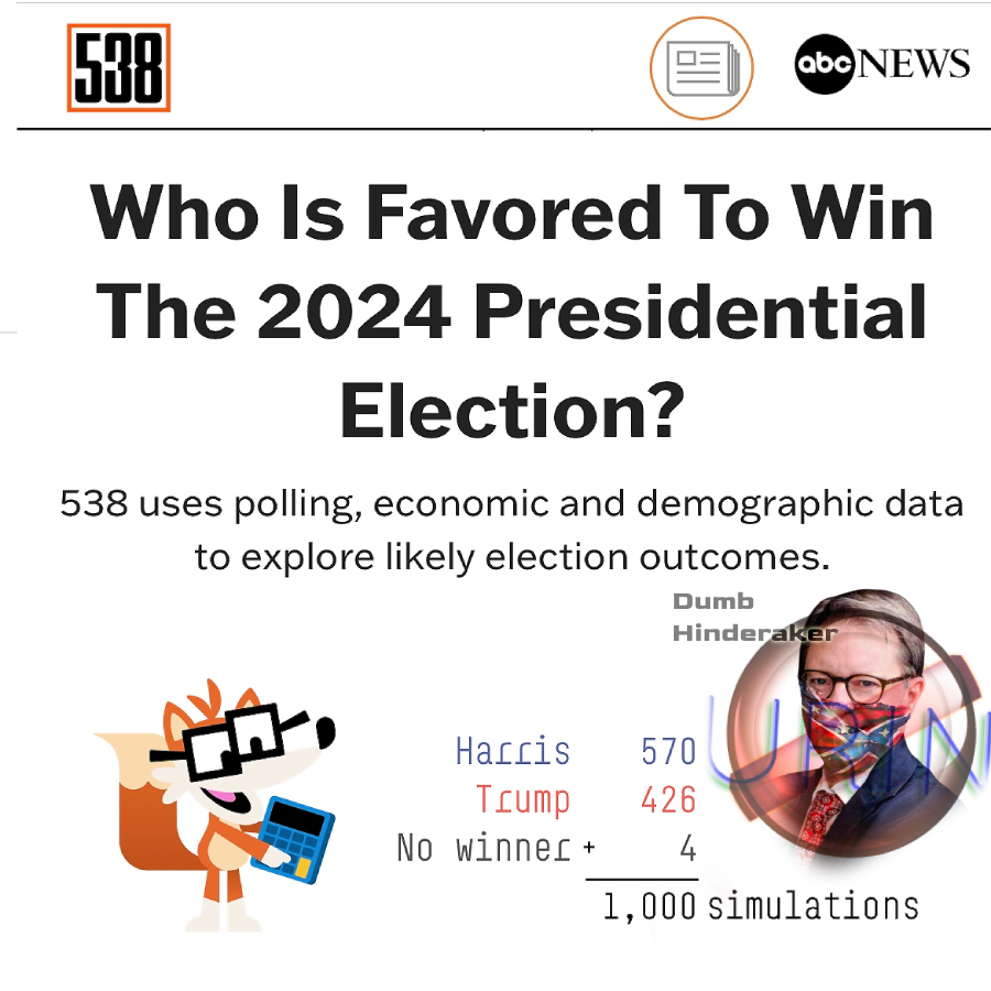 There you have it. And certainly, something wild (well outside all the polling, as happened in ‘16) could happen, but 538.com was right in 2008, 2020, 2012 (missed on 2016), 2018, 2020 and 2022. And Trump is a much more known quantity now, than he was in 2016. And that in no manner helps his chances.
