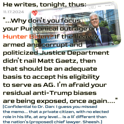 This jamoke — in Paul’s comment section — equates Rep. Matt Gaetz… an elected leader, and proposed top lawyer in the US government, with a private citizen, with admitted addiction issues — to say that if the DoJ did not indict Gaetz… he should be considered fit to serve, as actually innocent of sex-trafficking and drug use charges — which are the subject of a forthcoming US House Committee Ethics report (controlled by his own GOP).
