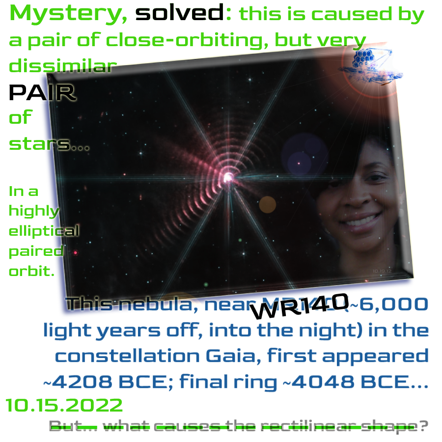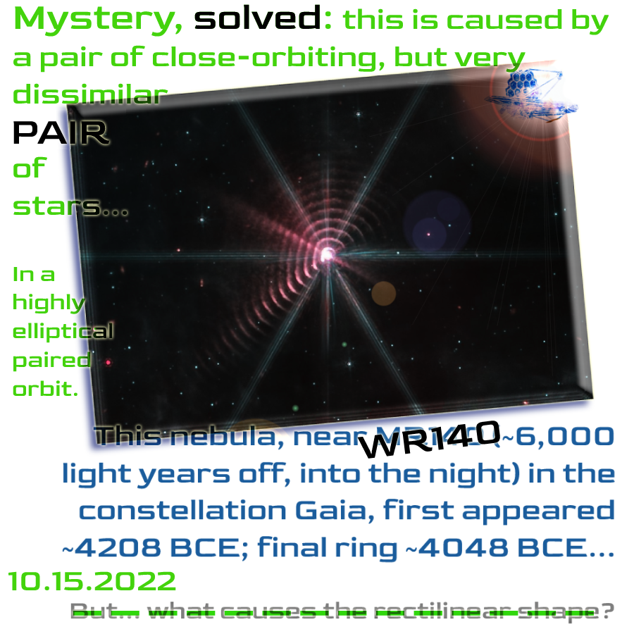 [Originally published 10.15.2022] Back in early September, we mentioned what we thought might be an enduring open question: what physics might be at work to create the strange, sort of rectangular wavelets, at right spinning off of Wolf-Rayet 140 (near Gaia).