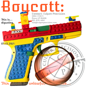 Now several of these fly-by-night, largely huckster led later-gen hand pistol companies are going under as well. And I am here for it. [At right is a malevolently moronic Utah/Texas company that was making fully-operational “Lego” branded pistols — using the Lego bricks entirely without an IP license (of course!), and clearly aiming it… at children. It went under in 2021.]