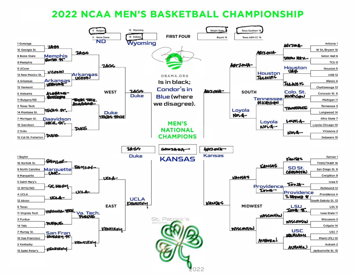 If either Duke or Kansas pulls out a win today… I will have beaten Mr. Obama, for only the third time in 12 long years.