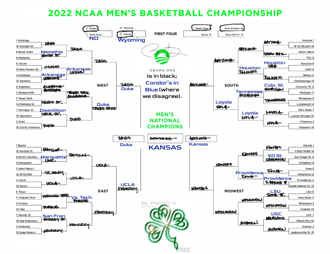 But as chance would have it, he has no remaining teams in the hunt — and at least until tonight, I still have both Kansas and Duke. So… I win.