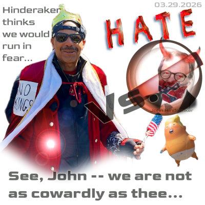 This afternoon, John is bloviating about his perhaps one minute coming appearance (likely this coming Wed., he says — but I bet it is tonight, on Weekend edition, Sunday) on Online NewsHour, on PBS — to provide a supposed “counterpoint” — to the No Kings coverage by the public broadcasting network. He was interviewed by Judy Woodruff, he says. [He may yet get cut from the segment; we shall see.]